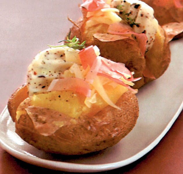 3. Cartofii copţi se taie în două şi se presară cu telemea rasă, şunculiţă afumată tăiată felii şi caşcaval ras. Se pune apoi câte o bucată din untul aromat şi se ornează cu verdeaţă tocată mărunt.