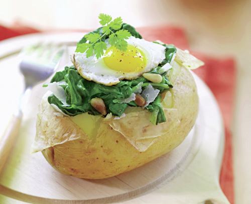 3. Cartofilor li se scobeşte un gol care se umple cu spanacul sotat. Deasupra se pun seminţele de pin şi un ou de prepeliţă