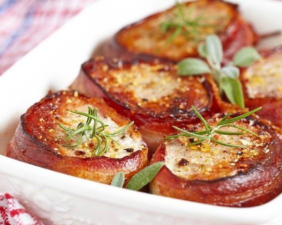 După 20 minute, scoate cartofii și lasă-i un pic la răcit, cât să poți lucra apoi cu ei făr să îți ardă mâinile. Taie-i cam 1 cm la unul dintre capete. Întorce cartoful cu capacul tăiat în sus și taie capătul opus în zigzag. Cu ajutorul unei lingurițe sau al unui aparat special de scobit, golește mijlocul cartofilor. Învelește-i în câte 4 felii de bacon pe fiecare și prinde-le cu scobitori ca să nu se desfacă.