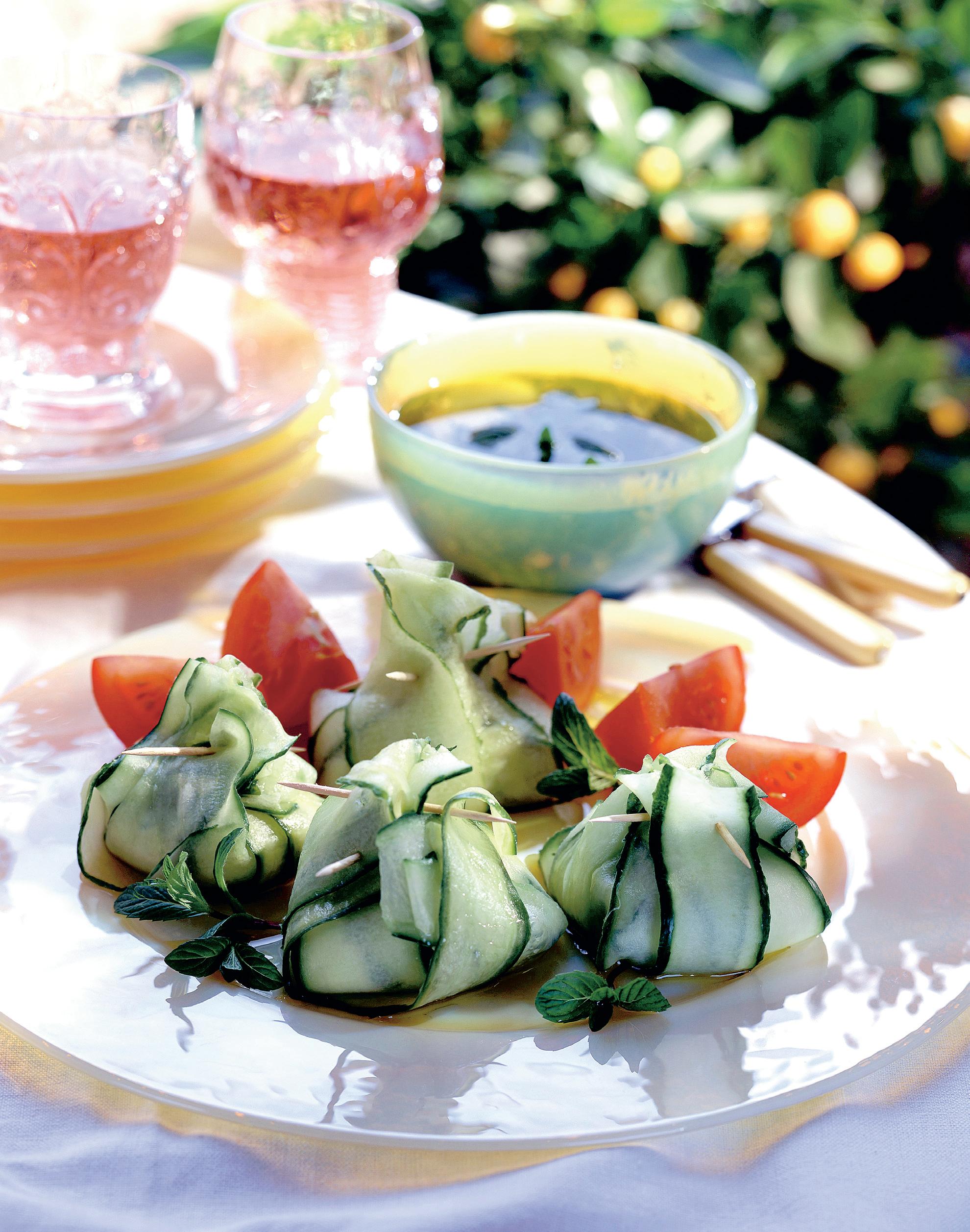 1. Castraveţii se spală, se curăţă şi se taie pe lung în felii subţiri. Se pun într-un castron, se dau cu un praf de sare şi se lasă deoparte, până încep să se înmoaie puţin.