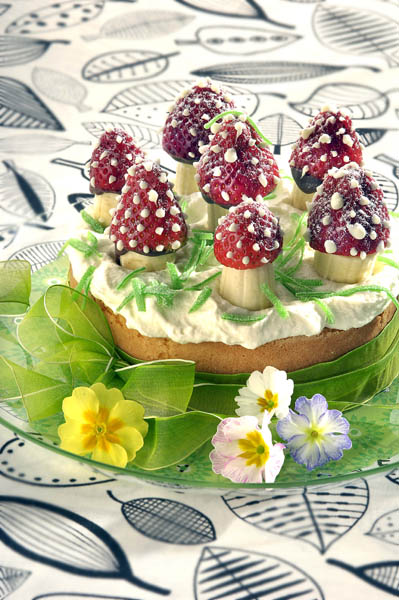 4. După ce s-a copt blatul şi s-a răcit la temperatura camerei, se taie, se însiropează, se pune un strat de frişcă şi se ornează cu ciupercuţe formate din banane, ciocolată şi pălărioare din căpşunele cu frişcă.