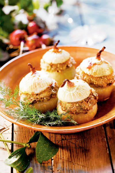 3. Se umplu cepele cu această compoziţie şi se aşază într-o cratiţă unsă cu puţin unt. La fiecare ceapă se mai pune câte o lingură de smântână amestecată cu puţin mărar şi se acoperă cu capacul tăiat. Se presară restul de miez de ceapă tocat mărunt, sucul de roşii şi roşiile tăiate cubuleţe. Se toarnă apoi supa de legume şi se coace în cuptorul încins, la foc potrivit, aproximativ 30-35 de minute.
