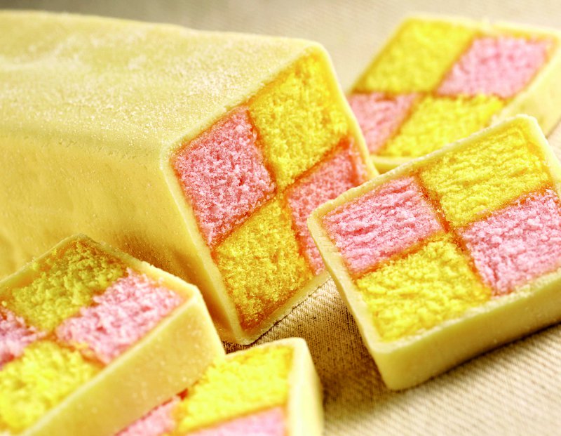 4. Checul se montează astfel: fiecare jumătate de chec se taie pe lung, în două părţi egale. Glazura de marţipan se întinde cu sucitorul, aşa încât să se formeze un dreptunghi de 20×30 cm. În mijlocul lui, se aşază o fâşie de chec alb lipită cu gem de caise de o fâşie roz. Peste acest strat se întinde gem, apoi se repetă procedura cu fâşiile rămase, având grijă ca deasupra celei albe să fie una roz şi invers. Se rulează apoi foarte strâns glazura de marţipan, se feliază şi se serveşte.