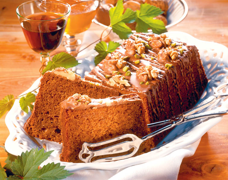 3. Se lasă puţin să se răcească, apoi se scoate din tavă şi se răstoarnă pe o folie din aluminiu. Când se răceşte, se acoperă cu glazură de ciocolată şi se ornează cu nuci şi fistic.