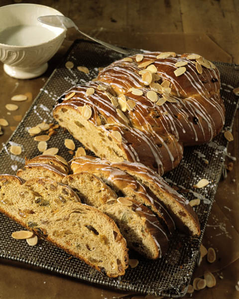 1. Se cerne făina într-un castron, în mijloc se face o adâncitură în care se pune drojdia înmuiată în lapte călduţ şi se lasă 10 minute lângă o sursă de căldură. După 10 minute se pun untul, restul de lapte cu zahărul, aromele, stafidele, precum şi o parte din fulgii de migdale, coaja de lămâie şi lămâia zaharisită. Se frământă cu aluatul şi se lasă la dospit.