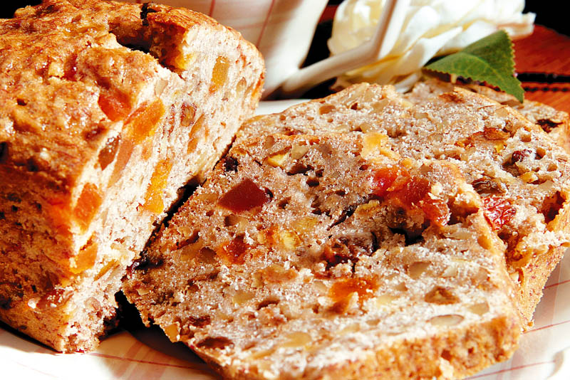2. Albuşurile se bat spumă cu zahărul şi zeama de lămâie. Se adaugă gălbenuşurile, smântâna, laptele, untul frecat spumă, făina amestecată cu praful de copt, stafidele, coaja de lămâie şi rahatul de fructe tăiat. Se amestecă totul uşor şi se pune în două forme de chec tapetate cu hârtie de copt.