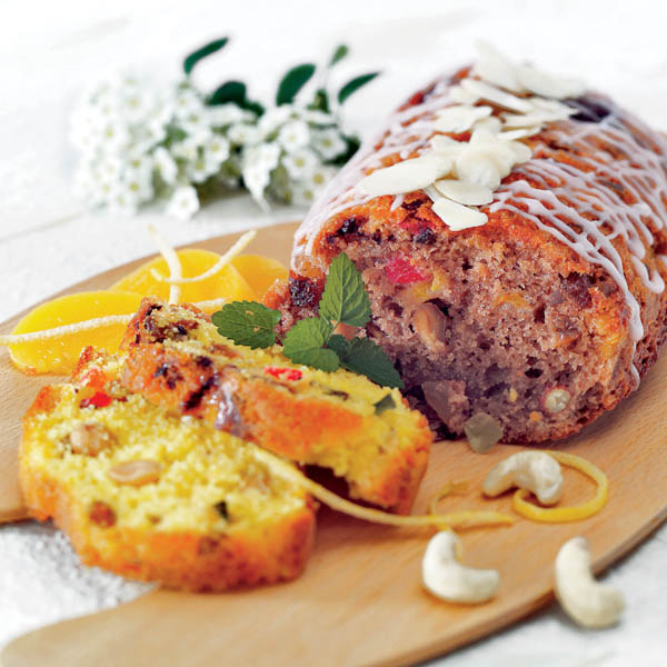 2. Treptat se adaugă făina cernută cu praful de copt şi la sfârşit albuşurile bătute spumă, stafidele, caisele confiate tăiate cubuleţe, coaja confiată de portocale, cireşele, nucile, alunele şi migdalele. În timp ce se amestecă, se toarnă şi câte puţin lapte.
