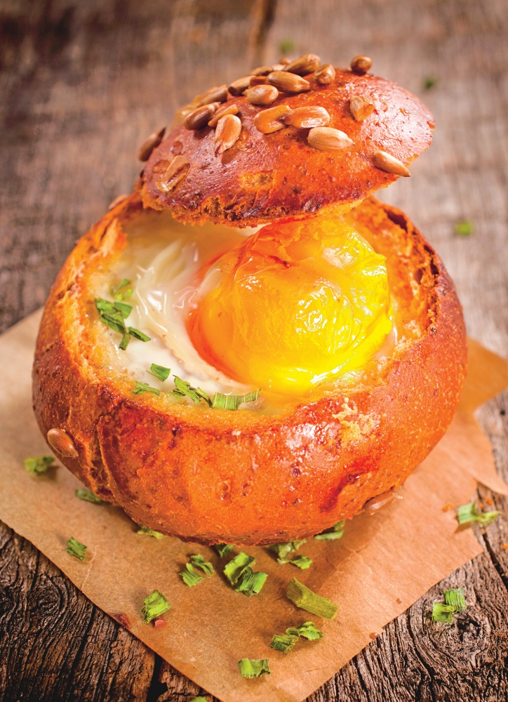 4. Se presară gălbenuşul cu sare şi se dă la cuptor pentru 15 minute. Chiflele umplute se pot servi cu ceapă verde.