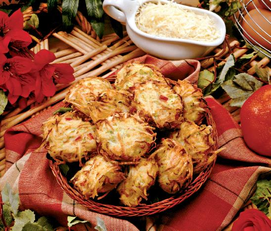 2. 500 g de cartofi se fierb în coajă, se curăţă şi se presează. Se lasă să se răcească. Cartofii rămaşi se curăţă şi se dau prin răzătoare. Se curăţă ceapa şi se taie mărunt. Se opăreşte roşia câteva secunde, se curăţă de coajă şi se taie cubuleţe.