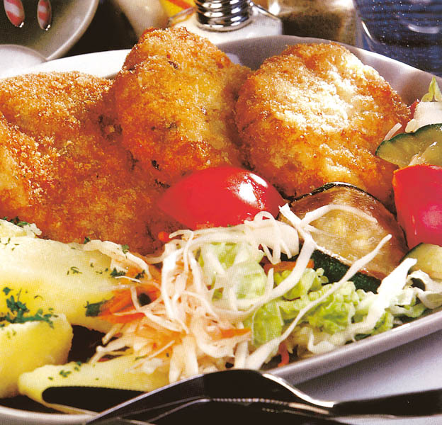 3. Se formează chifteluţele, se dau prin pesmet şi se prăjesc în ulei încins. Se lasă la scurs pe o hârtie absorbantă. Se servesc cu garnitură de legume şi salate de sezon.