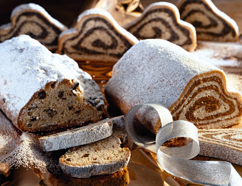 2. Se încălzesc 400 g unt şi margarina, apoi se lasă să se răcorească. Când untul s-a răcit, dar e încă lichid, se începe frământarea. Se scurg de zeamă fructele din rom, se tăvălesc prin făină, apoi se adaugă în aluat, împreună cu scorţişoara, nucşoara, sarea, restul de zahăr şi de lapte. Se frământă cu forţă, până când aluatul se desprinde de pe marginile bolului. Se acoperă şi se mai lasă 30 de minute la crescut, la cald.