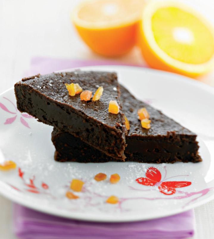 5. Se tapetează o formă de copt cu hârtie specială. Se întinde uniform compoziţia de ciocolată. Se introduce tava în cuptorul preîncălzit, pentru 20 de minute. Se scoate din cuptor și se lasă la răcit. Se servește rece, pudrată cu zahăr.