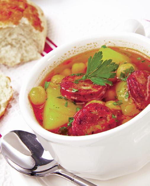 4. După ce au fiert legumele, se adaugă sucul de roşii, sarea, piperul, boiaua iute, se mai lasă să clocotească 10 minute şi se serveşte cu bucăţile de cârnaţi şi pătrunjel proaspăt tocat mărunt.