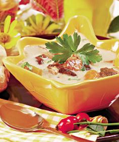 5. Piureul de ciuperci şi de legume se amestecă şi se subţiază cu zeama în care au fiert zarzavaturile. Se condimentează cu sare şi piper, după gust, se adaugă cubuleţele de dovleac turcesc şi crema de legume şi se serveşte cu pătrunjel şi crutoane din pâine neagră.
