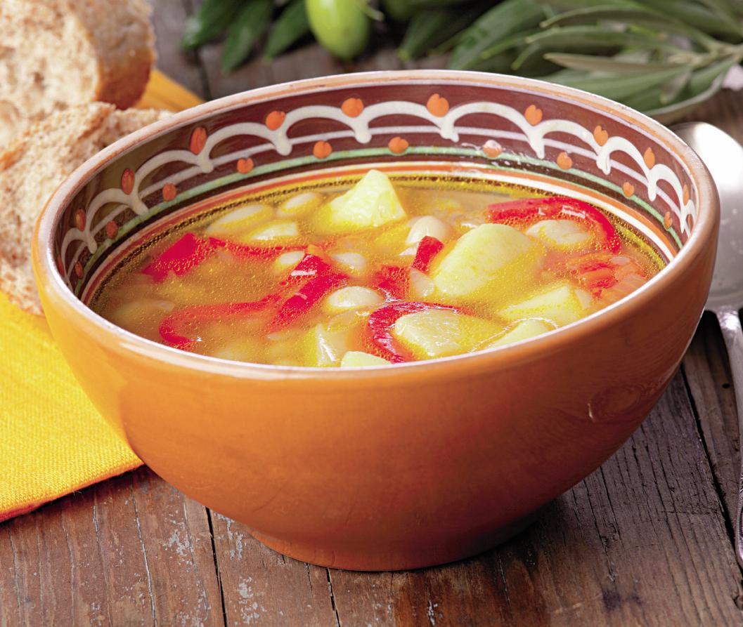 1. Se curăţă şi se spală cartofii, dovleceii şi morcovii. Se taie cubuleţe şi se pun să fiarbă în 2 l de apă cu sare, ulei şi piper. Ceapa şi gogoşarii se curăţă, se spală şi se toacă mărunt.