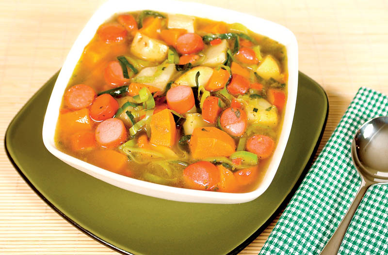 2. Ceapa se toacă mărunt, morcovii şi rădăcinile de pătrunjel se taie rondele, de circa 1 cm grosime, ardeiul se taie felii, iar cartofii şi ţelina se taie cubuleţe.