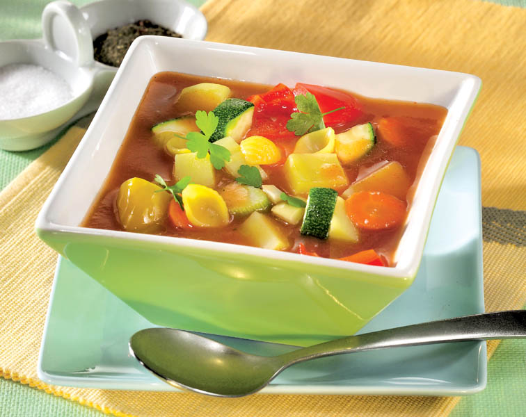 1. Se curăţă şi se spală toate legumele, se taie bucăţi mari şi se pun să fiarbă într-o oală de 3 litri de apă cu sare şi 2 linguri de ulei.