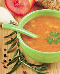 4. Ciorba de roşii se ornează cu frunzuliţe de rozmarin şi pătrunjel şi se serveşte cu crutoanele aromate şi puţin picante.