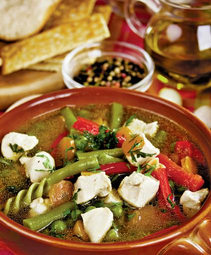 4. Peste legumele fierte, se adaugă pastele şi sosul de roşii. Se condimentează cu sare şi piper, se acreşte cu zeamă de lămâie şi se mai lasă să dea în câteva clocote. După ce s-a făcut, se serveşte ornată cu pătrunjel şi tarhon.