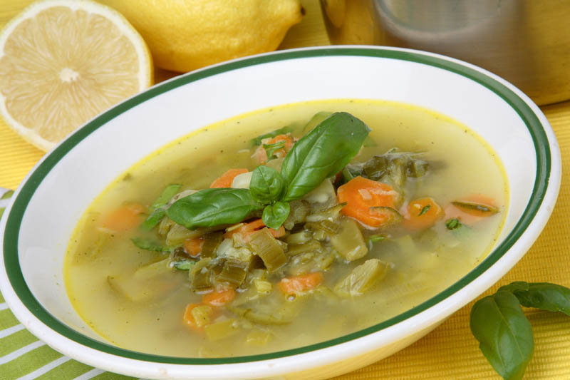 3. După ce s-au pregătit toate legumele, se pun într-o oală cu apă, ulei şi sare după gust. Se lasă să fiarbă, iar spre sfârşit se pun roşiile decojite şi tăiate şi zeama de lămâie şi se mai lasă să dea în 2-3 clocote.