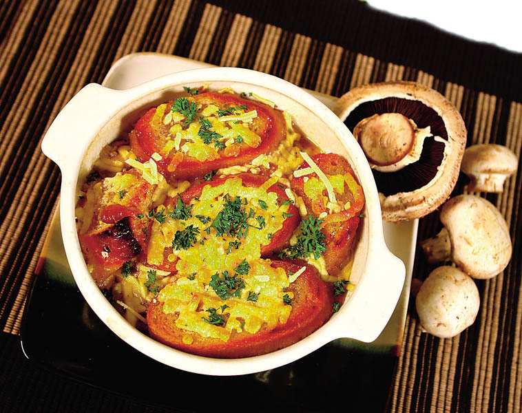 4. Se tapetează o formă cu unt sau ulei şi se aşază primul rând de pâine. Se rade caşcavalul, se presară pe deasupra feliilor şi apoi se pune un rând de ciuperci şi se acoperă cu un alt strat de pâine prăjită şi caşcavalul ras.