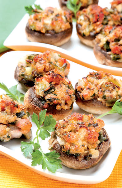 3. Pălărioarele se aşază în tavă, se presară sare şi câteva picături de ulei şi se umplu cu compoziţia preparată. Se bagă în cuptorul bine încins şi se lasă 30 de minute.