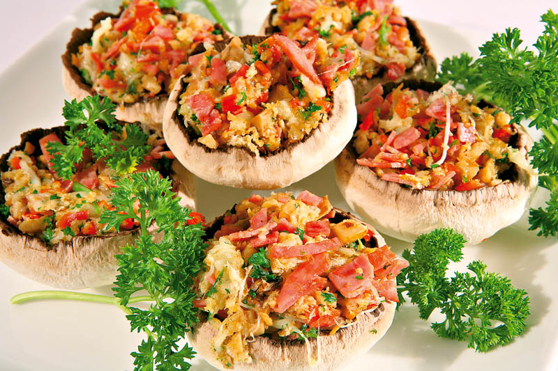 3. Pălăriuţele scurse de apă se umplu cu compoziţia de ceapă, iar pe deasupra se presară şunca prăjită.