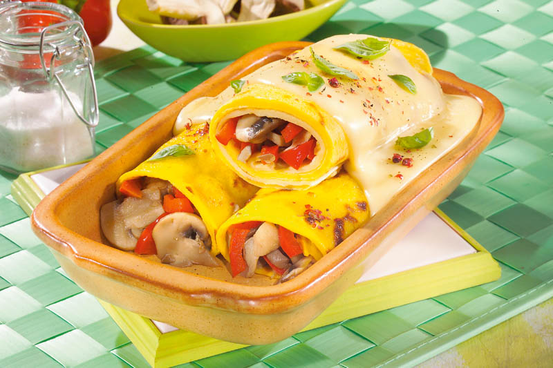 4. Pe fiecare clătită se pune câte o parte din această umplutură, apoi se presară brânza rasă şi se rulează. Se aşază într-un vas termorezistent uns cu unt, iar deasupra se pune caşcavalul ras. Se coc în cuptorul dinainte încins, la foc potrivit, 15-20 minute.