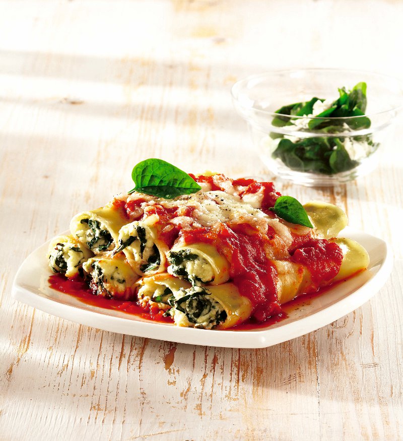 3. Brânza se amestecă cu albuşurile şi spanacul fiert şi scurs. Se presară un praf de sare şi se umplu foile de clătite. Rulourile se aşază într-o tavă unsă cu un strop de ulei şi se bagă în cuptorul bine încins. Se lasă să se rumenească aproximativ 30 de minute.