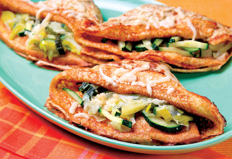 4. Clătitele se umplu cu dovleceii, se rulează sau se împachetează, şi se ornează cu caşcaval ras de post. Clătitele de post se pot servi şi cu dulceaţă sau cu nuci, depinde de preferinţă.