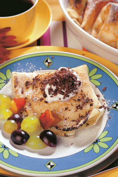 3. Se ung clătitele cu crema de ciocolată, apoi se presară boabe de struguri şi se adaugă câte o lingură de frişcă. Se împachetează şi se ornează cu frişcă, ciocolată rasă şi zahăr pudră.