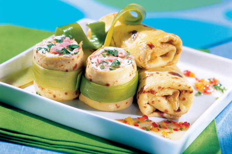 4. Clătitele se umplu cu cremă şi se rulează. Se aranjează pe un platou în formă de pacheţele, cu foi de ceapă verde. Se servesc ca aperitiv.
