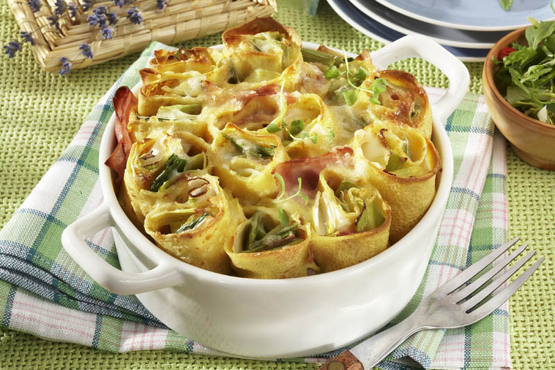 3. Peste praz, se adaugă 2- 3 linguri de pesmet. Se umplu clătitele cu baconul şi cu prazul şi se rulează cu mare atenţie ca să nu se rupă.
