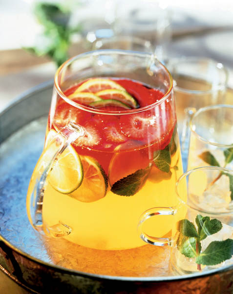 2. Se storc portocalele şi 2 lămâi, apoi se amestecă cu lichiorul de portocale şi 200 g căpşuni sau zmeura mixate, o lămâie tăiată felii şi câteva frunze de mentă. Se lasă la rece cel puţin o oră.