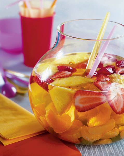 1. Ananasul se taie rondele, apoi se curăţă de coajă şi se taie cubuleţe. Se pune într-un bol mare, transparent şi se amestecă cu toate celelalte fructe spălate, curăţate şi tăiate felii sau cubuleţe. Se stropesc cu zeama de la o lămâie, se amestecă uşor şi se lasă deoparte.