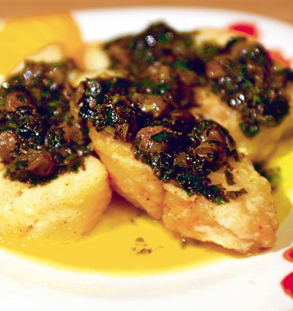 2. Pentru sos, se topeşte untul până când prinde o culoare maronie, după care se adaugă zeama de lămâie şi caperele, amestecând continuu. Se adaugă sare şi piper, după gust, iar la sfârşit se pune pătrunjelul mărunt tocat.