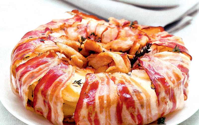 2. Se unge vasul cu unt, se presară pesmetul şi se aşază feliile de bacon, astfel încât să se poată acoperi compoziţia şi din interior şi din exterior. Se pun apoi straturi alternative de cartofi şi brânză, având grijă ca fiecare strat de cartofi să se ungă cu puţin unt şi să se presare cu puţină sare şi piper. Ultimul strat trebuie să fie de cartofi.