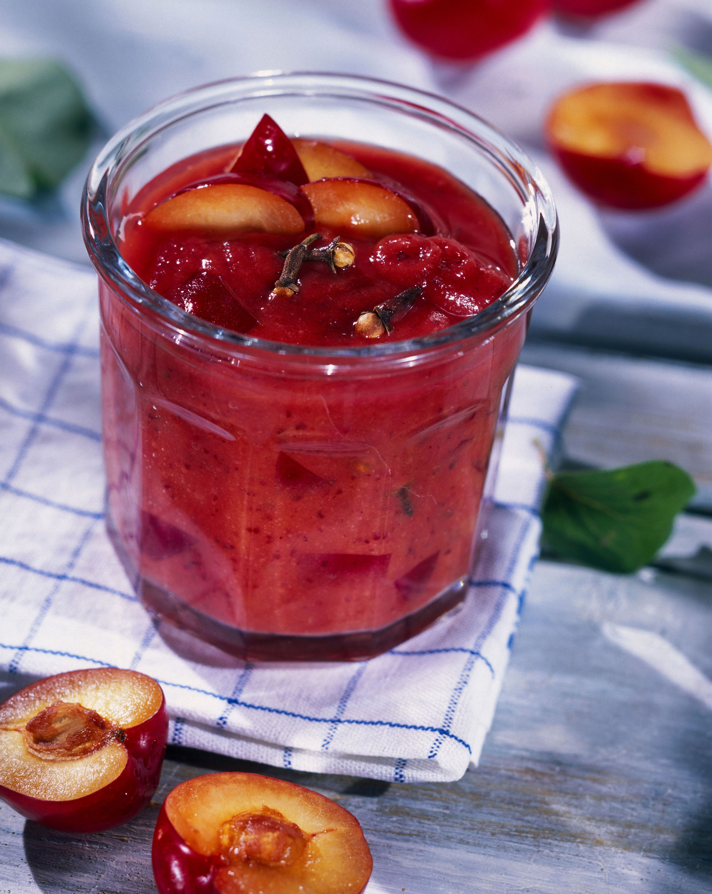 1. Se aleg fructe proaspete, nu prea coapte, se spală, se taie pe jumătate, se scot codiţele şi sâmburii şi se lasă la scurs (opţional, prunele se pot curăţa de coajă). Între timp, se prepară pe foc un sirop din apă, zahăr, cuişoare şi scorţişoară şi se pune pe foc. Când siropul începe să se lege puţin, se adaugă prunele şi se lasă la fiert până când acestea se înmoaie. Se amestecă uşor cu o lingură din lemn şi se spumează de câte ori este cazul.