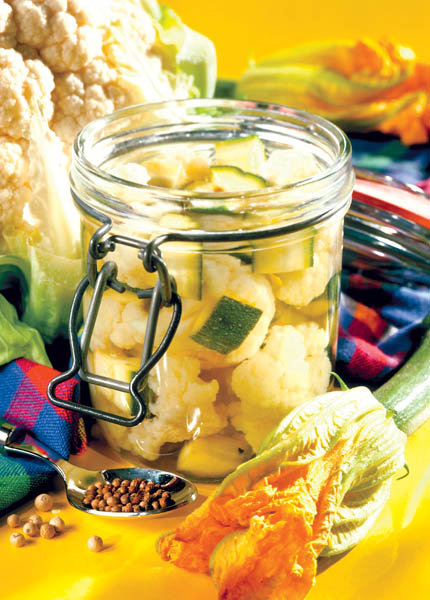 3. Se aşază conopida şi dovleceii în borcanele curate, apoi se toarnă compoziţia de oţet şi se acoperă cu capace. Se sterilizează 15-20 minute şi se mai lasă în apa fierbinte jumătate de oră. Se scot apoi borcanele şi se învelesc într-un şervet mai gros. Se lasă să se răcească până a doua zi, apoi se aşază în cămară.