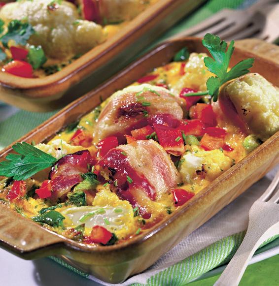 3. După ce a scăzut sosul de legume, se opreşte focul şi se lasă la temperatura camerei. Separat, se feliază caşcavalul şi baconul. Bucheţelele de conopidă se înfăşoară în feliile de caşcaval şi bacon.