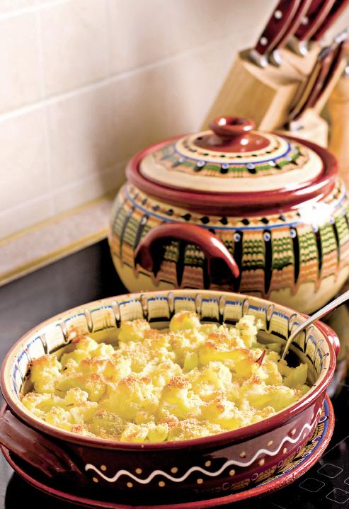 3. Dacă a fiert conopida, se scoate din apă, se lasă să se scurgă, să se răcească şi se desface în bucheţele mici. Se pun într-o tavă de ceramică şi se amestecă cu sosul alb, cu caşcavalul şi cu pesmetul.