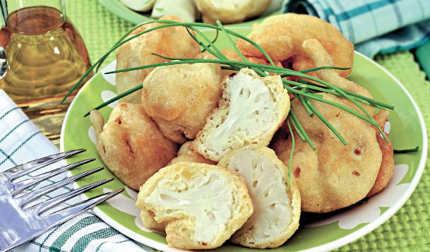 4. Se pune uleiul în tigaie şi se lasă să se încingă. Se iau bucăţile de conopidă şi se pun la prăjit. Se lasă să se pătrundă, să devină aurii şi se scot cu spumiera într-un bol tapetat cu hârtie absorbantă. Conopida pané se serveş1te ornată cu frunze de ceapă verde.