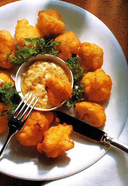 2. Se amestecă 1 gălbenuş de ou cu făina, berea, un vârf de cuţit de sare şi piper. Albuşurile se bat spumă şi se adaugă la aluat. Buchetele de conopidă se trec prin acest aluat şi se prăjesc în ulei încins.