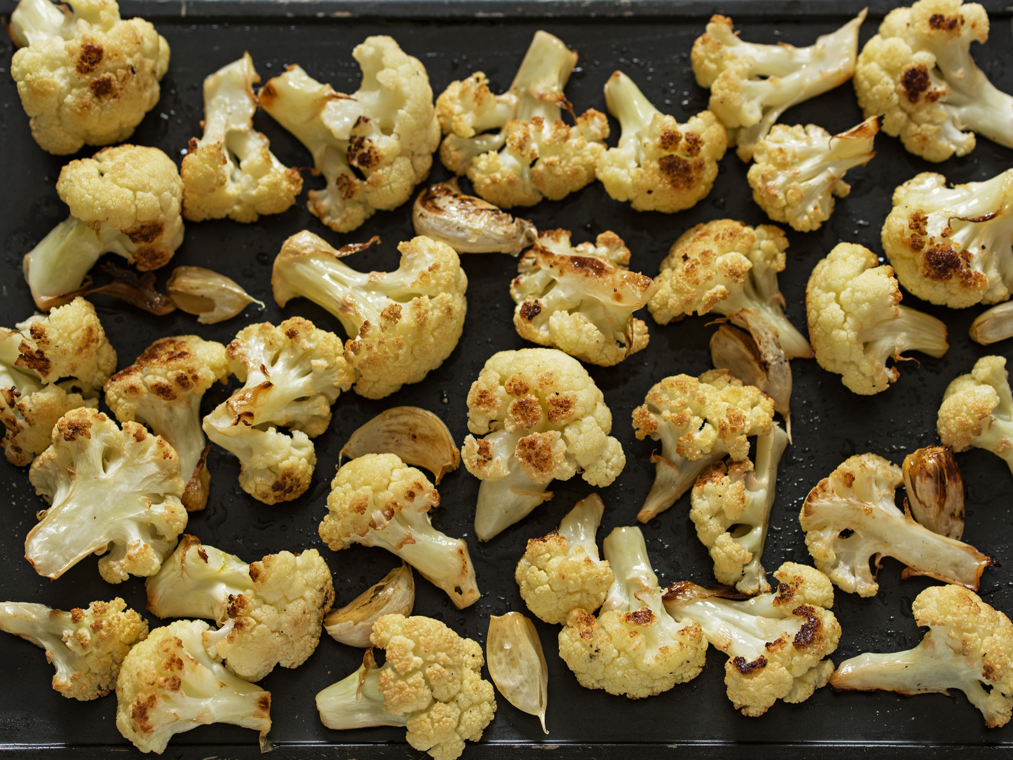 Tapetați o tavă cu unt și puneți deasupra o hârtie pergament. Aliniați buchețelele de conopidă pe un singur rând pe tavă și dați la cuptor pentru 20-30 minute. La jumătatea timpului, întoarceți conopida pe partea cealaltă pentru a se coace egal. Când conopida devine aurie și crocantă la margini, o scoateți din cuptor.