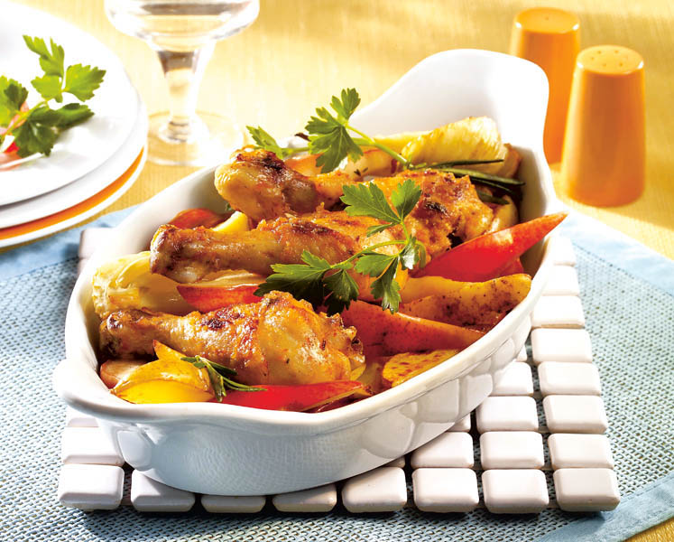 2. Între timp, se curăţă cartofii, se taie felii, se spală, se condimentează cu sare, piper şi usturoiul pisat şi se pun în tavă împreună cu copanele de pui.