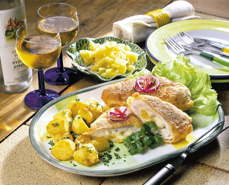 4. Între timp, se curăţă restul de cartofi, se spală, se taie cubuleţe şi se pun să fiarbă ca pentru piure. După ce au fiert, se scot şi se rumenesc câteva minute în unt, până capătă o pojghiţă aurie. Se servesc ornaţi cu verdeaţă alături de Cordon bleu.