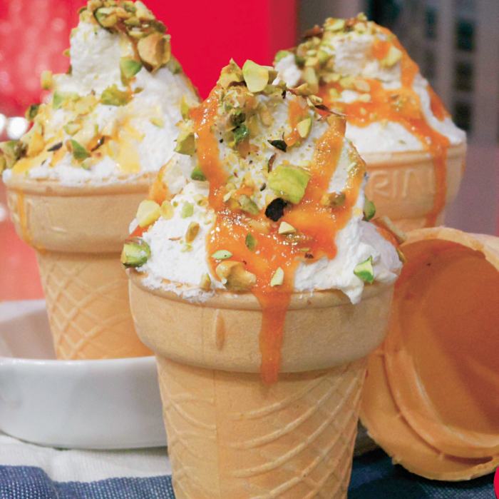Un desert delicios, rapid şi aspectuos. Prepară şi tu pentru familia ta cornete cu fistic şi caramel!