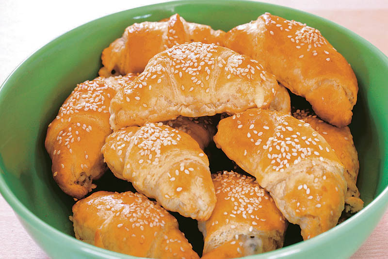 2. Se taie aluatul în pătrate cu latura de aproximativ 8 cm. Se pune pe fiecare câte o linguriţă de umplutură, se rulează în formă de cornuleţe şi se pun într-o tavă unsă cu unt. Se ung cu gălbenuş şi se presară cu susan.