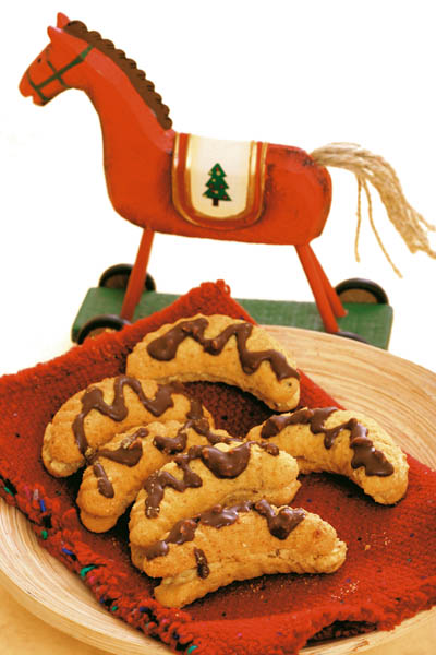 2. Se întinde aluatul într-o foaie groasă de 5 mm şi se taie cornuleţe, care se pun într-o tavă unsă cu grăsime. Se coc în cuptorul încins, la foc potrivit, 15 minute.