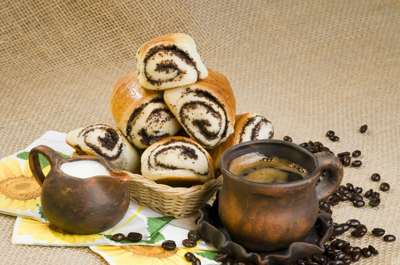 3. Aluatul crescut se întinde într-o foaie subţire de 5-6 mm, de formă dreptunghiulară. Se întinde umplutura, se rulează şi se taie bucăţi de 3-4 cm, care se aşază într-o tavă unsă cu puţin ulei. Se pune tava în cuptorul încins şi se coace la foc potrivit, până se rumenesc puţin, aproximativ 30 de minute.
